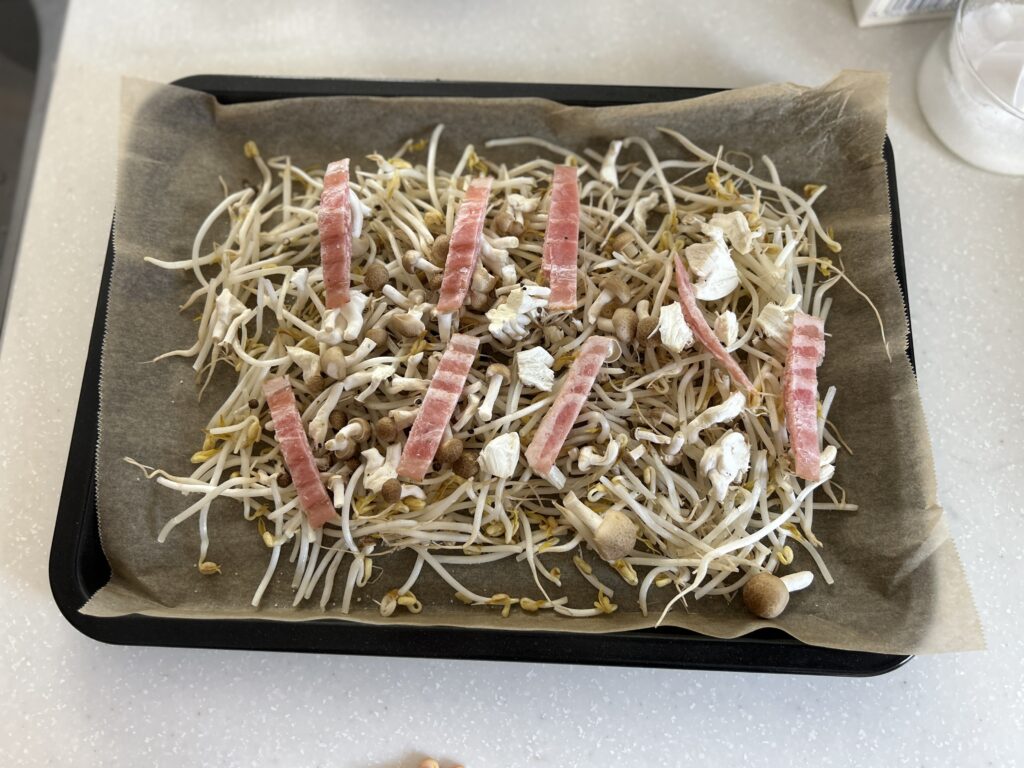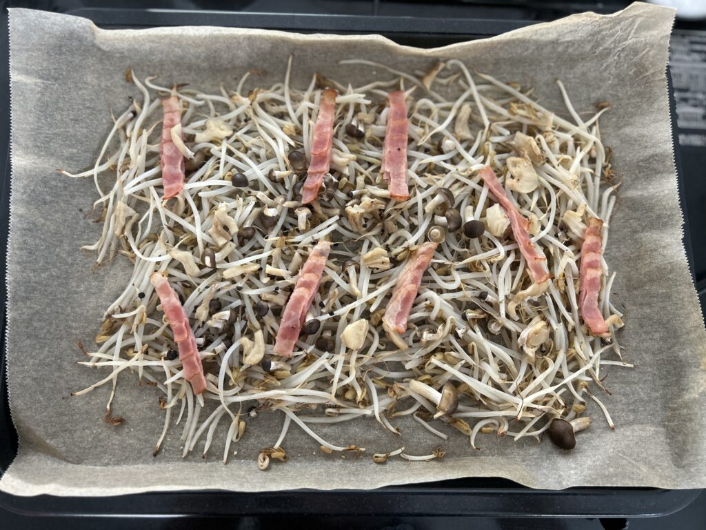 ・天板に、下からもやし、きのこ、ベーコンの順に平たくのせる。(ベーコンは冷凍のまま、はさみで切りました。)軽く塩コショウする。