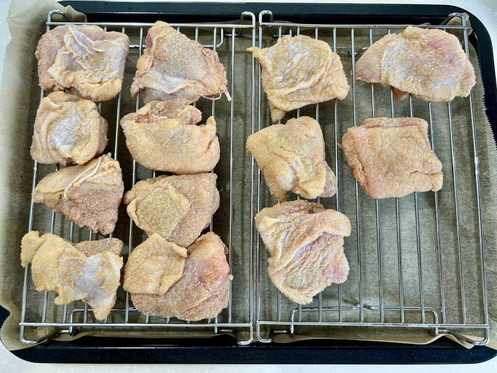 ・鶏もも肉のぶつ切りと市販のから揚げの素(水溶きでないタイプ)を袋に入れて、シャカシャカふります。