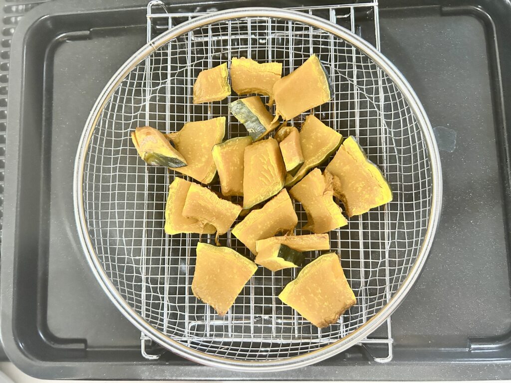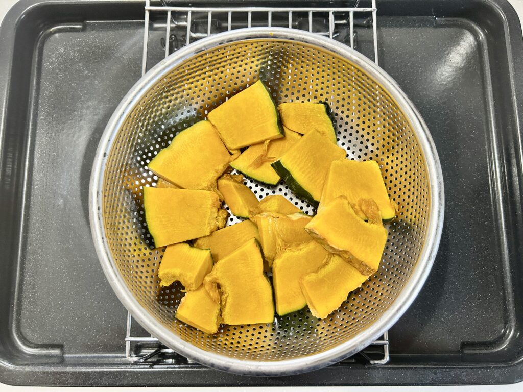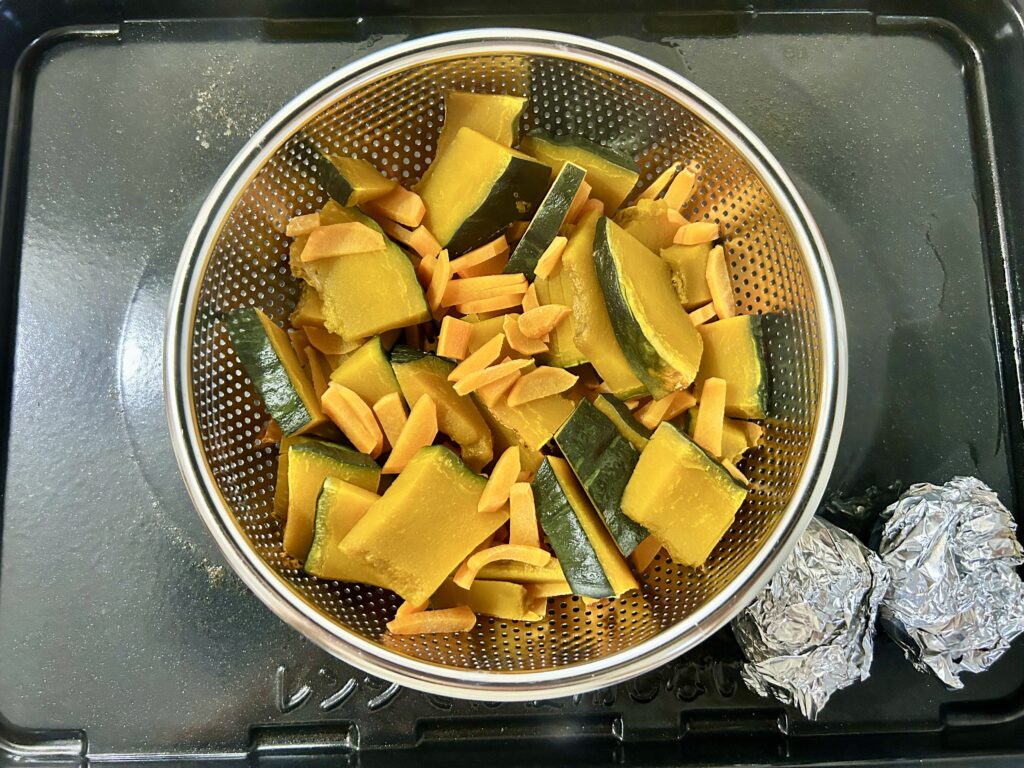 ・(調理前の写真を撮り忘れましたが、)カボチャと人参をカットし、ざるに入れます。