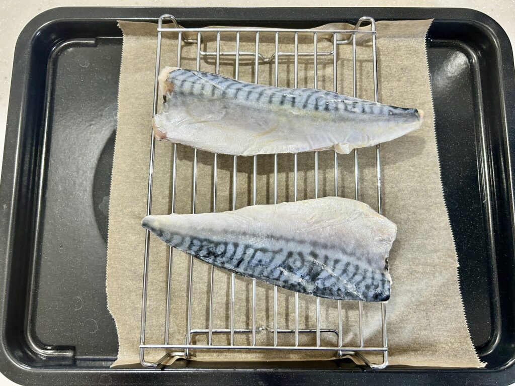 ・塩サバを冷凍のまま天板にのせる。(生協の骨とり塩サバを使用しました。)